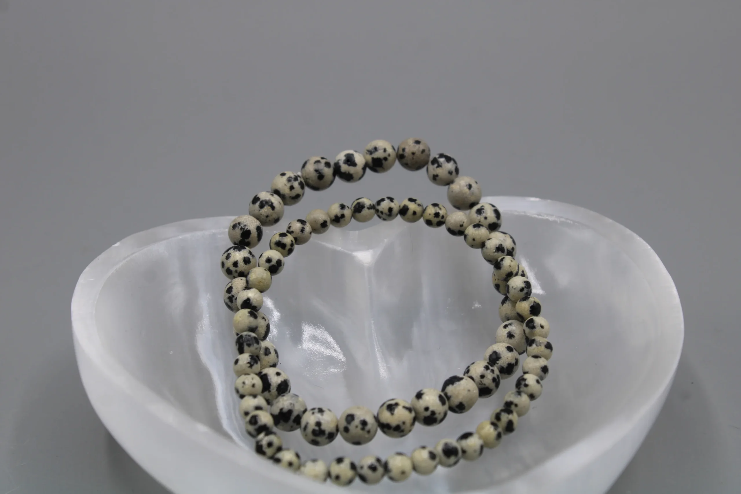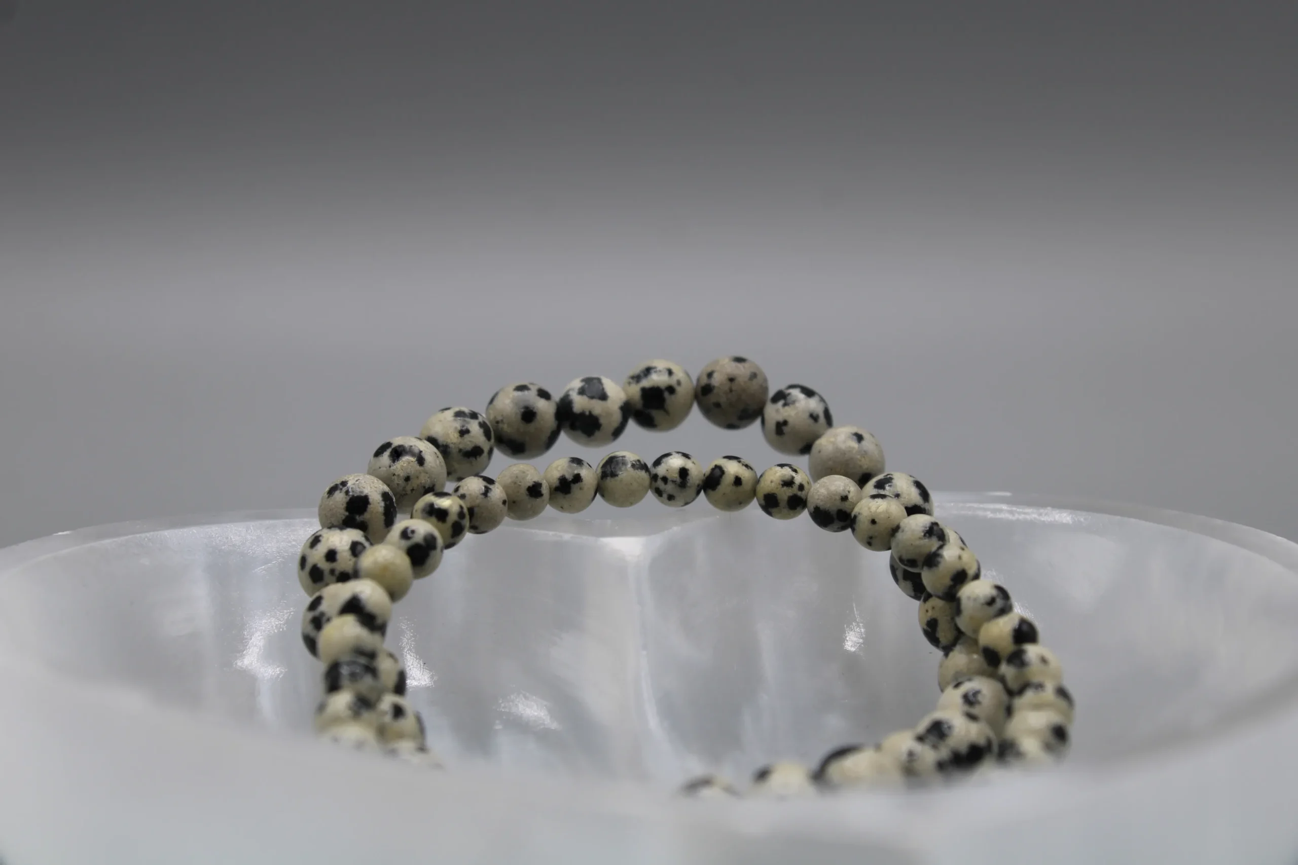 Dalmatiner Jaspis armbånd er et iøjnefaldende stenarmbånd, der skiller sig ud med sin lyse cremebase og ikoniske, spættede mønster i sort og brun – inspireret af den klassiske dalmatiner. De blankpolerede, naturlige perler er håndudvalgt for deres ensartede finish og livlige spil og er trukket på en stærk, fleksibel elastik for behagelig pasform hele dagen. Resultatet er et stilrent, alsidigt smykke, der passer til det meste, og som let kan bæres alene eller stackes med ur og andre armbånd for et personligt udtryk.