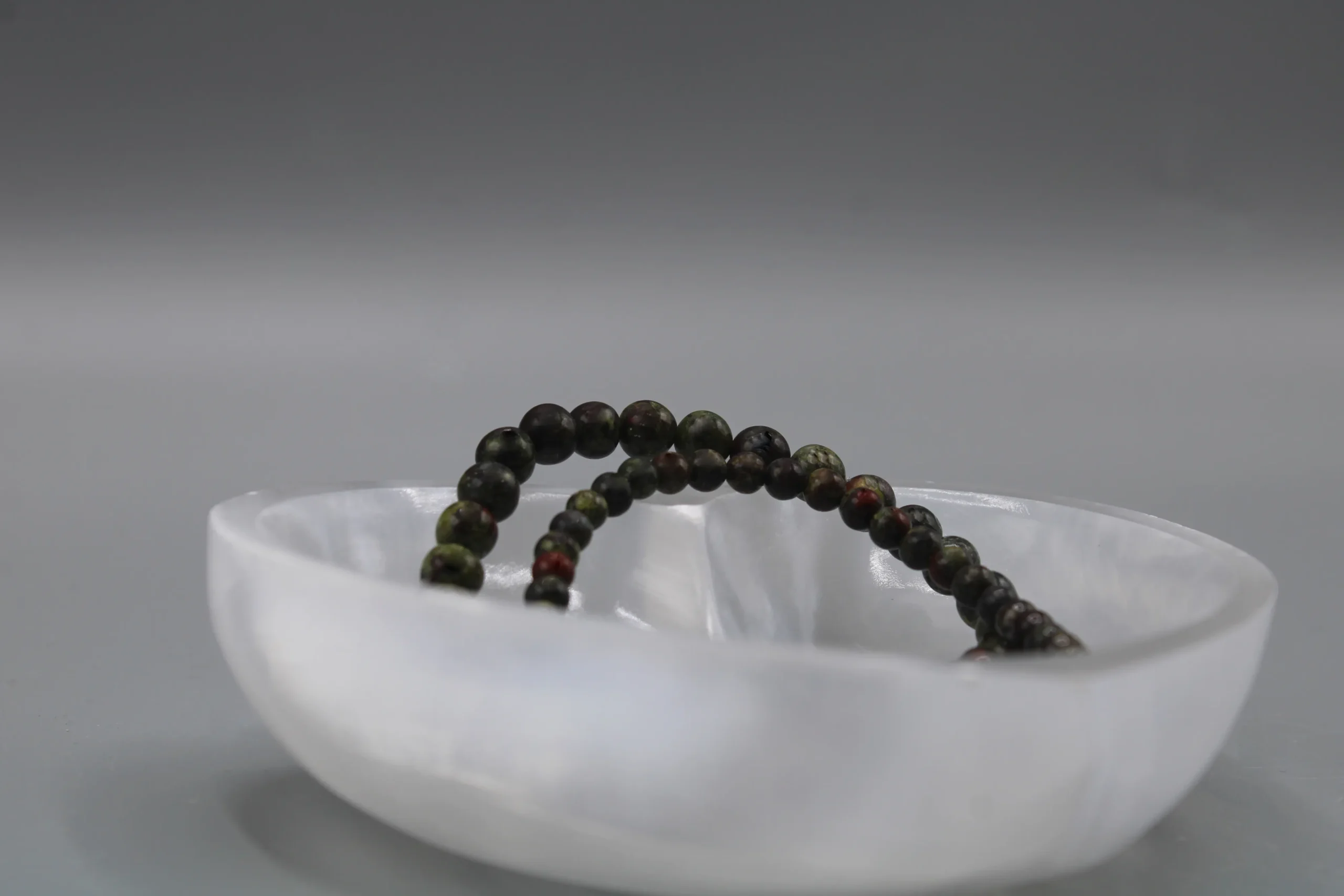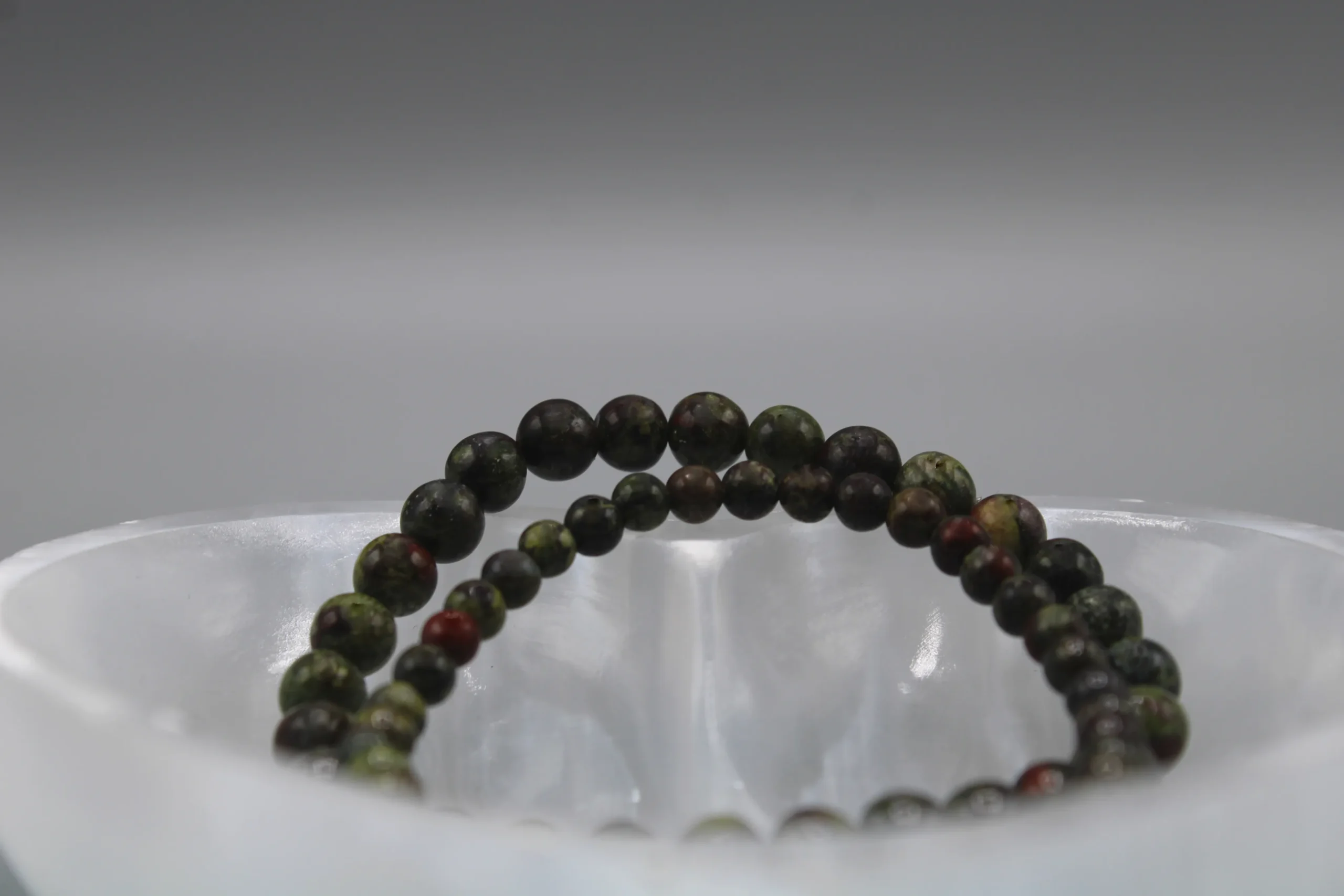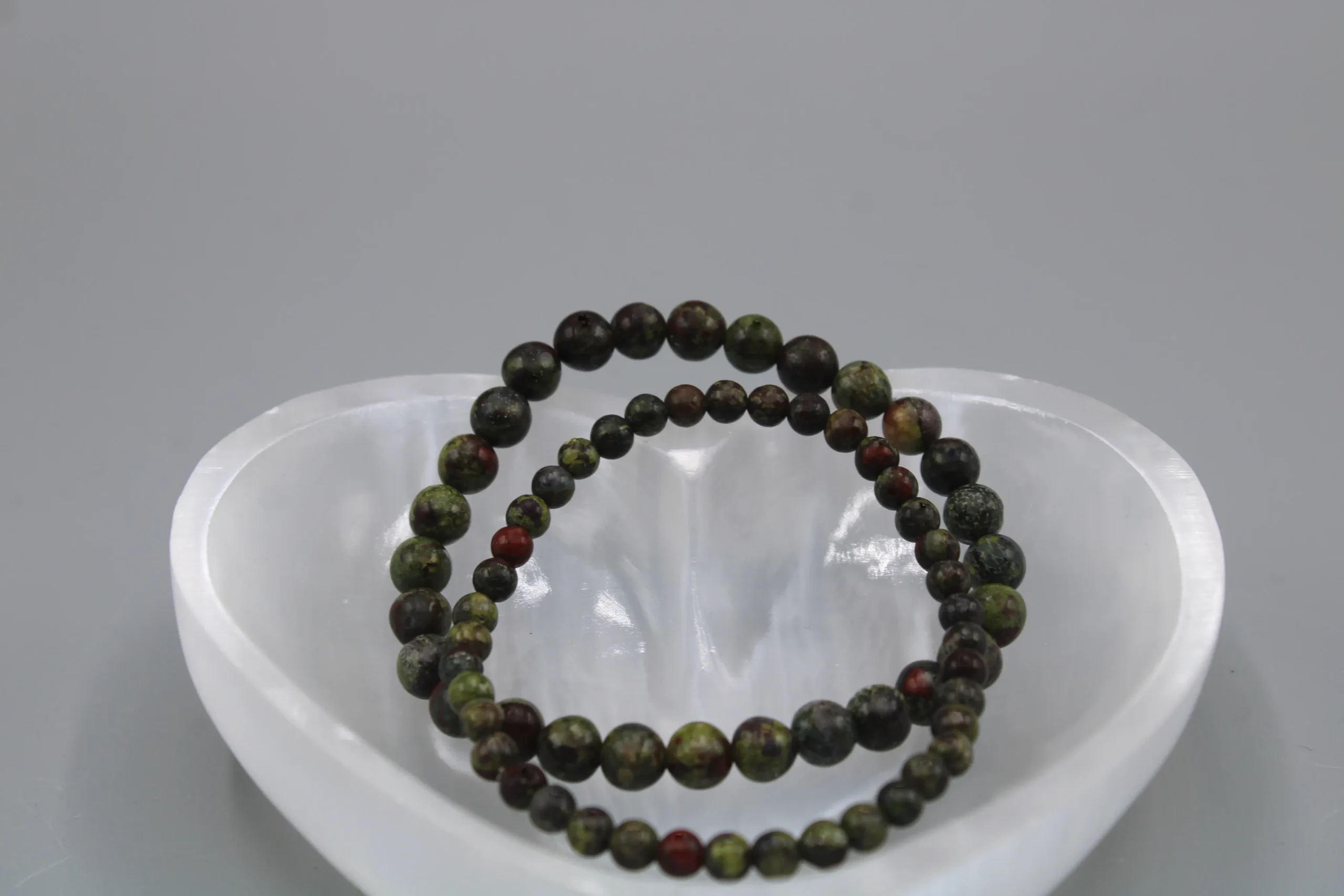 Drage jaspis armbånd er et stenarmbånd til dig, der vil forene rå natur med stilrent design. De glatpolerede perler af drage jaspis viser et unikt farvespil med dyb skovgrøn base, vinrøde indslag og diskrete mørke årer – et levende mønster, hvor intet armbånd er helt ens. Perlerne er håndudvalgt og samlet på en slidstærk, fleksibel elastik, som giver en behagelig pasform hele dagen.