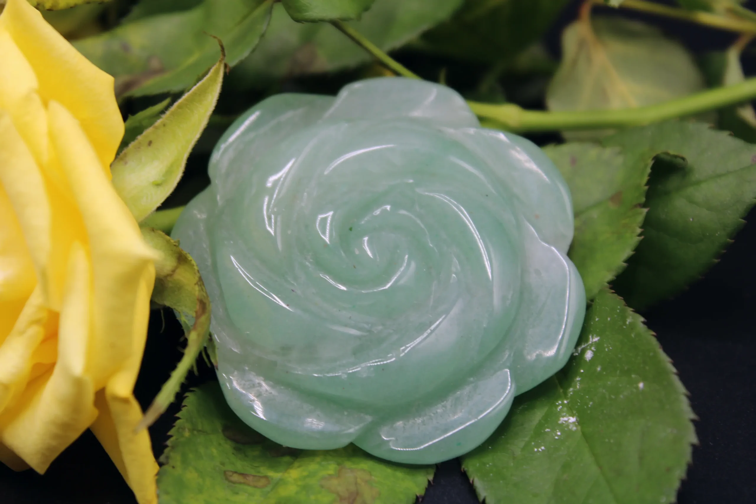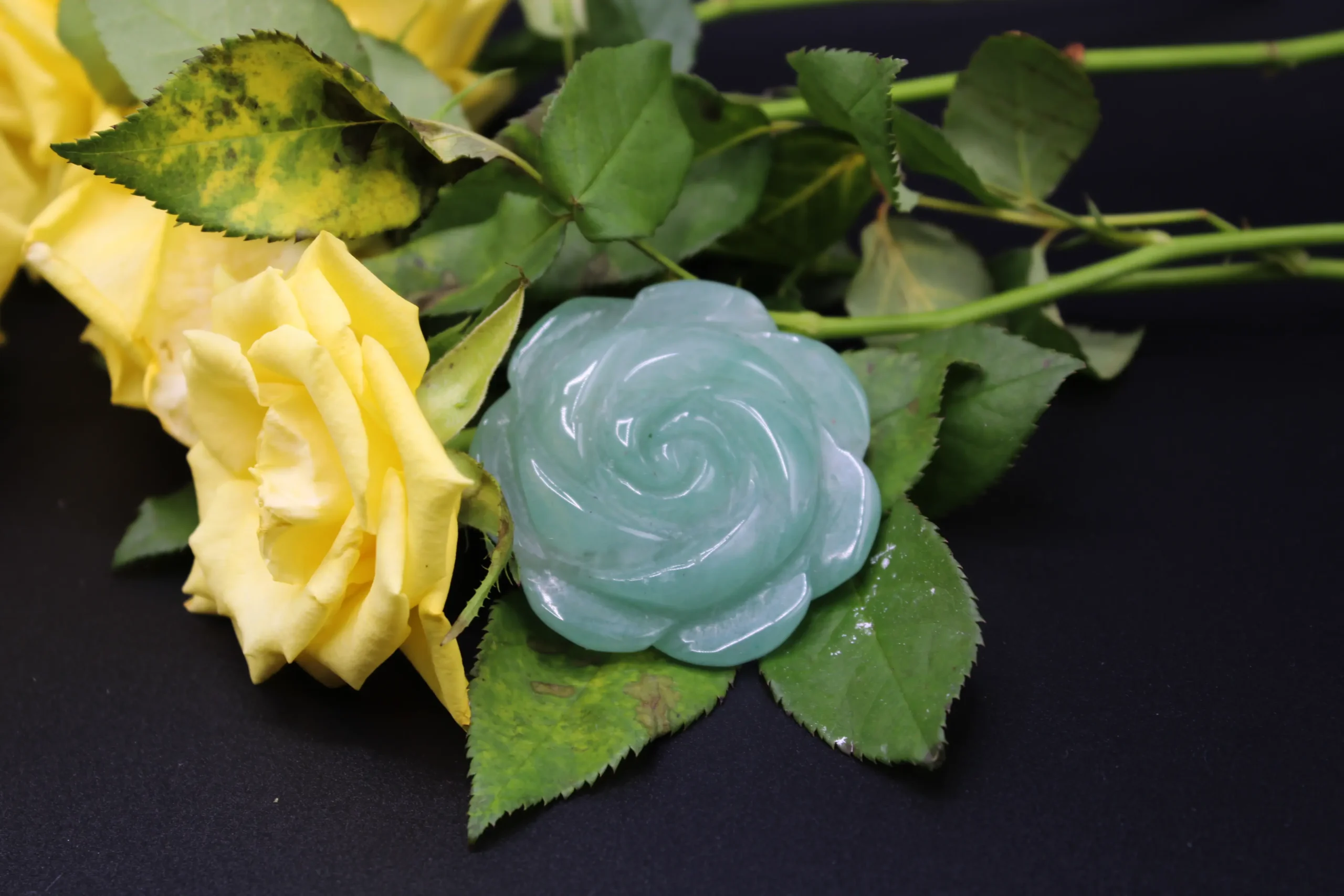 Hver rose er nøje udskåret i naturlig grøn aventurin, kendt for sine levende, smaragdgrønne nuancer med fine glimt og en let, silkeagtig glans.