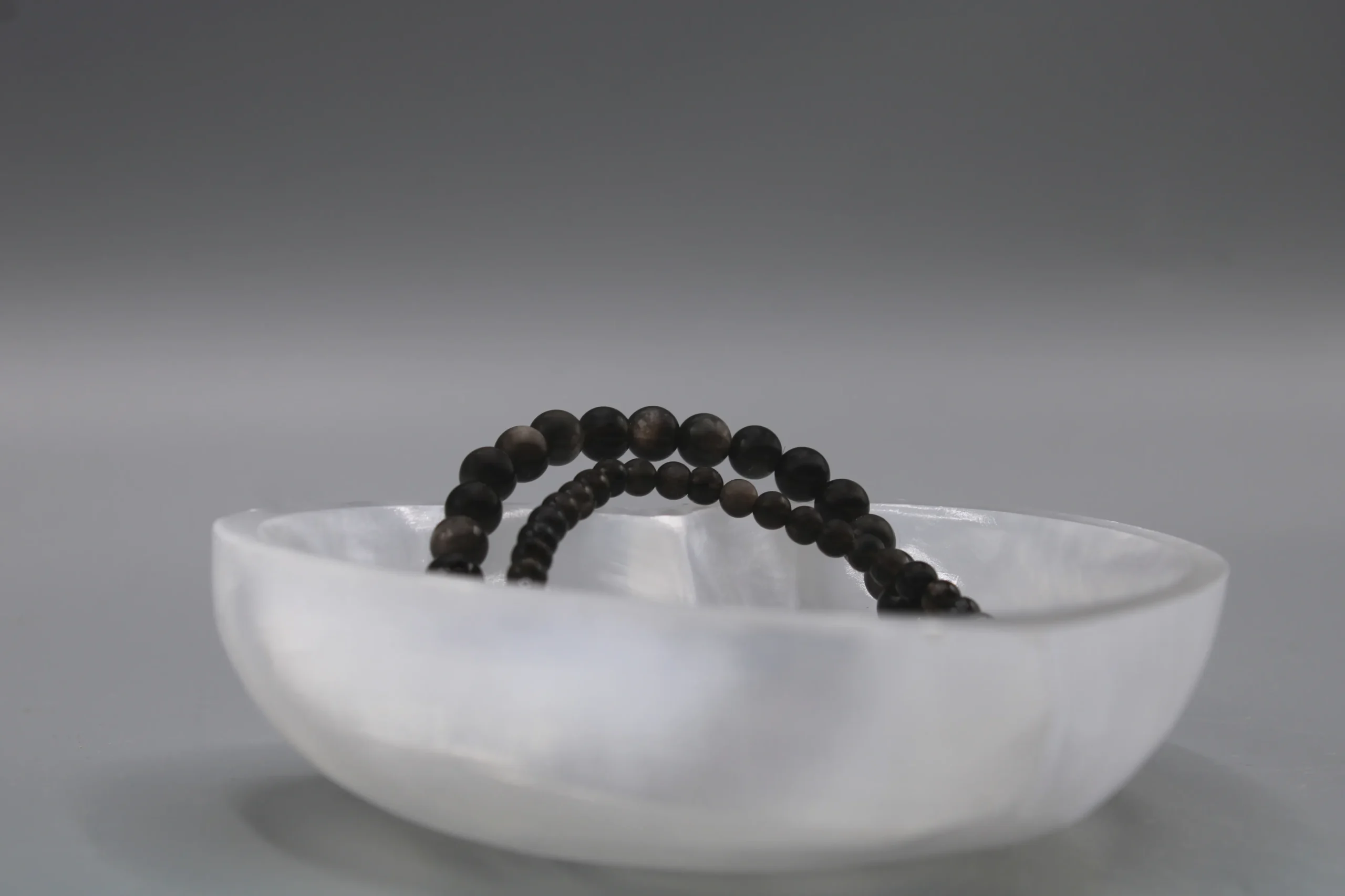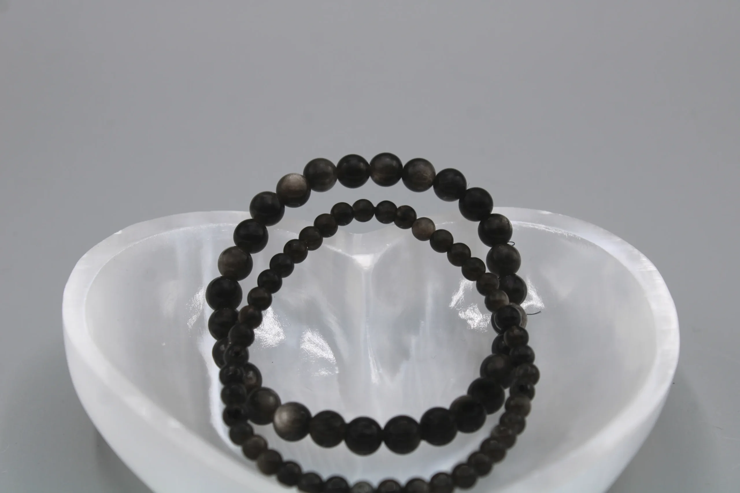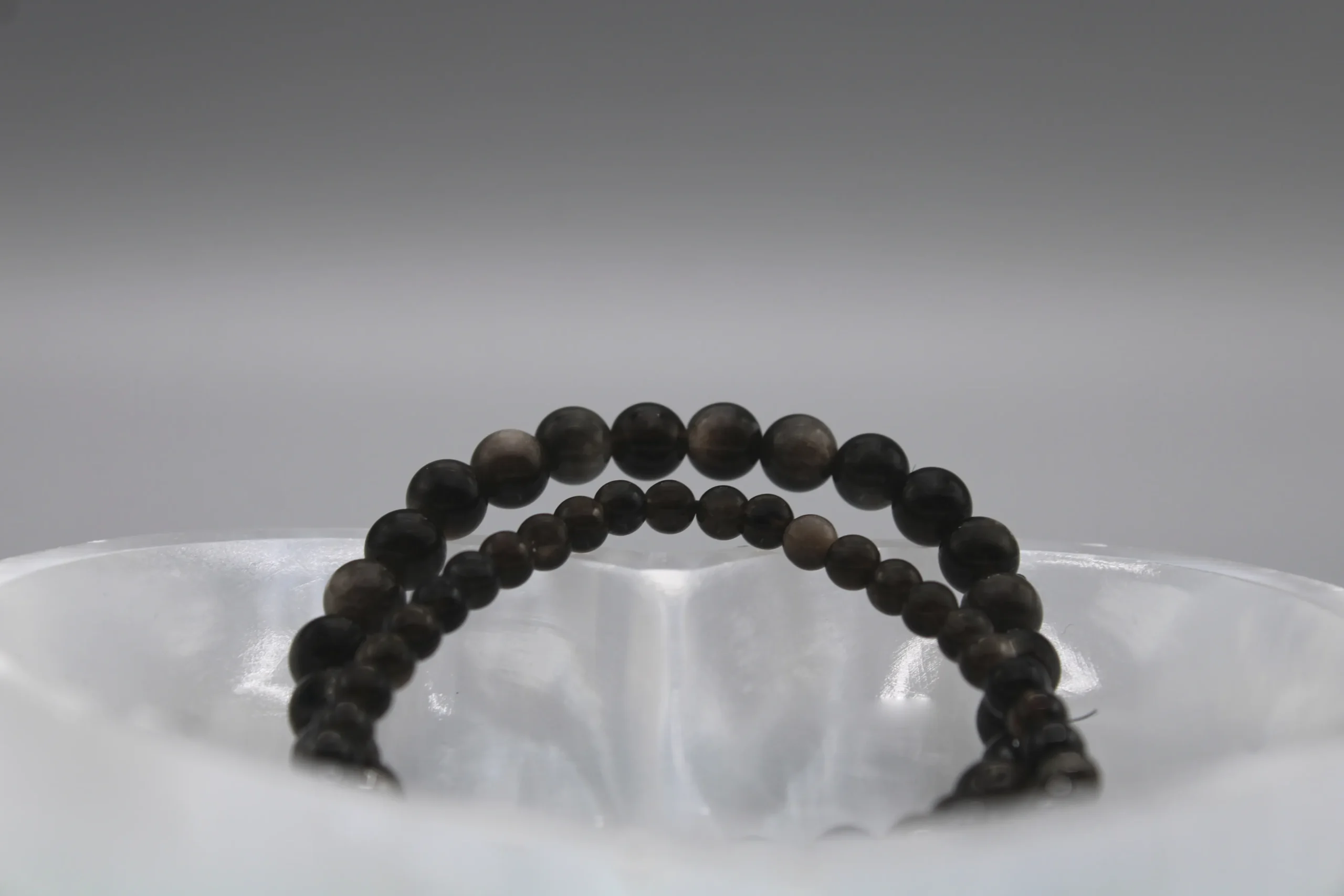 Sølv Obsidian armbånd forener skarp elegance med diskret mystik og er det perfekte valg, hvis du ønsker et obsidian armbånd med ekstra dybde. De håndpolerede perler af vulkansk glas skifter smukt mellem dybsort og køligt sølvskær, når lyset rammer – et metallisk spil, der gør hvert armbånd levende og unikt. Perlerne er trukket på en stærk, fleksibel elastik, der sikrer behagelig pasform hele dagen. Det enkle, moderne design fungerer lige godt alene som rent statement eller i stack med ur og andre smykker og passer til både hverdagsstil og mere formelle outfits.